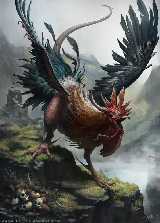 The Great Cockatrice is a large creature with the body of a beast and the head and legs of a rooster.