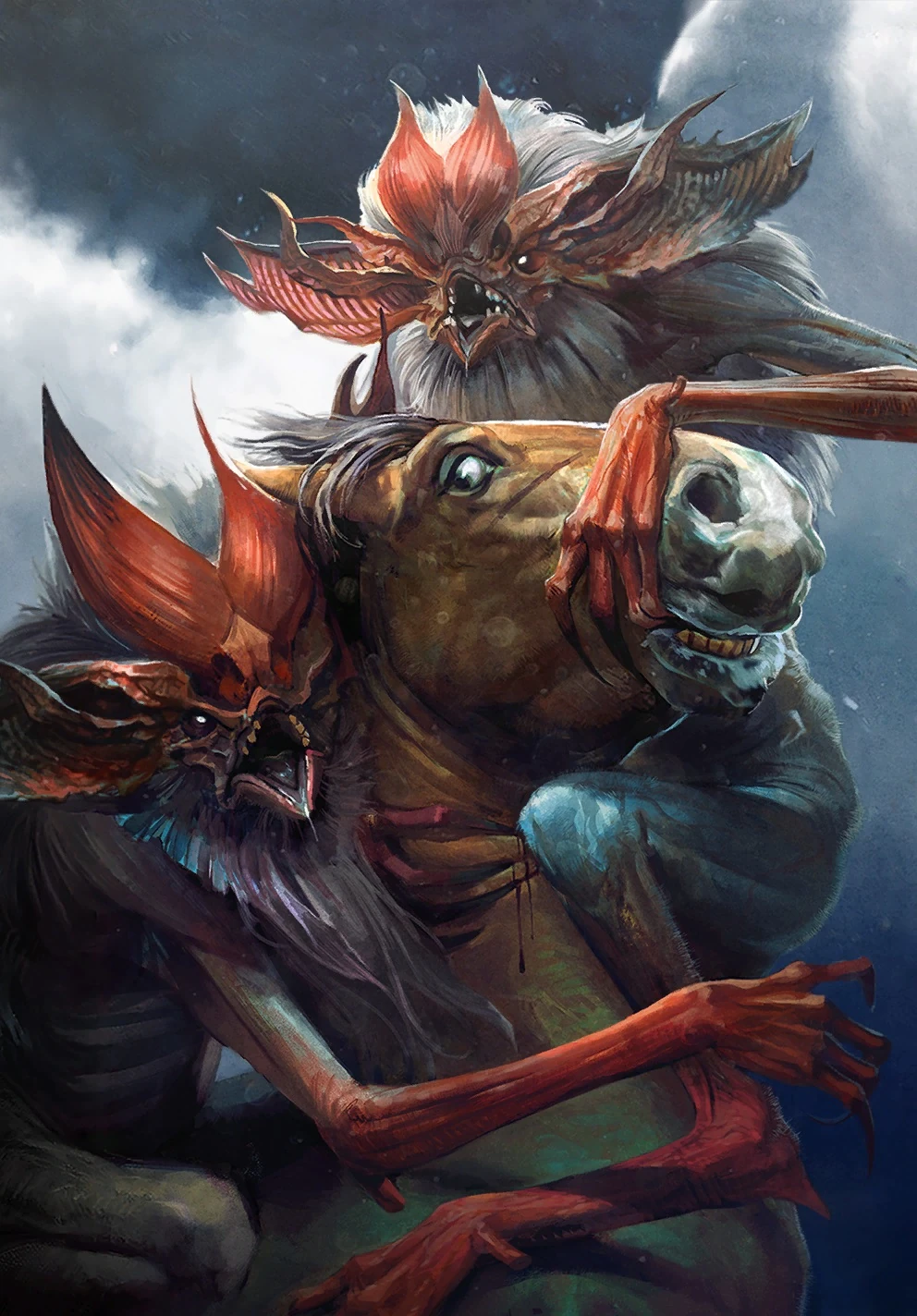 Like other lesser vampires, Ekimmaras are not, despite what village gossips might say, undead humanoids. Unlike their portrayals in ballads and legends, they look nothing like handsome, pale aristocrats with charming eastern accents, though, like Katakans or Nekurats, their stronger and clever cousins, they do bear a strong resemblance to overgrown bats. They also do not suck blood from the necks of virgins with a delicate, kiss-like bite — they tear them to shreds using long, sharp claws and then slurp the splattered blood off the ground.