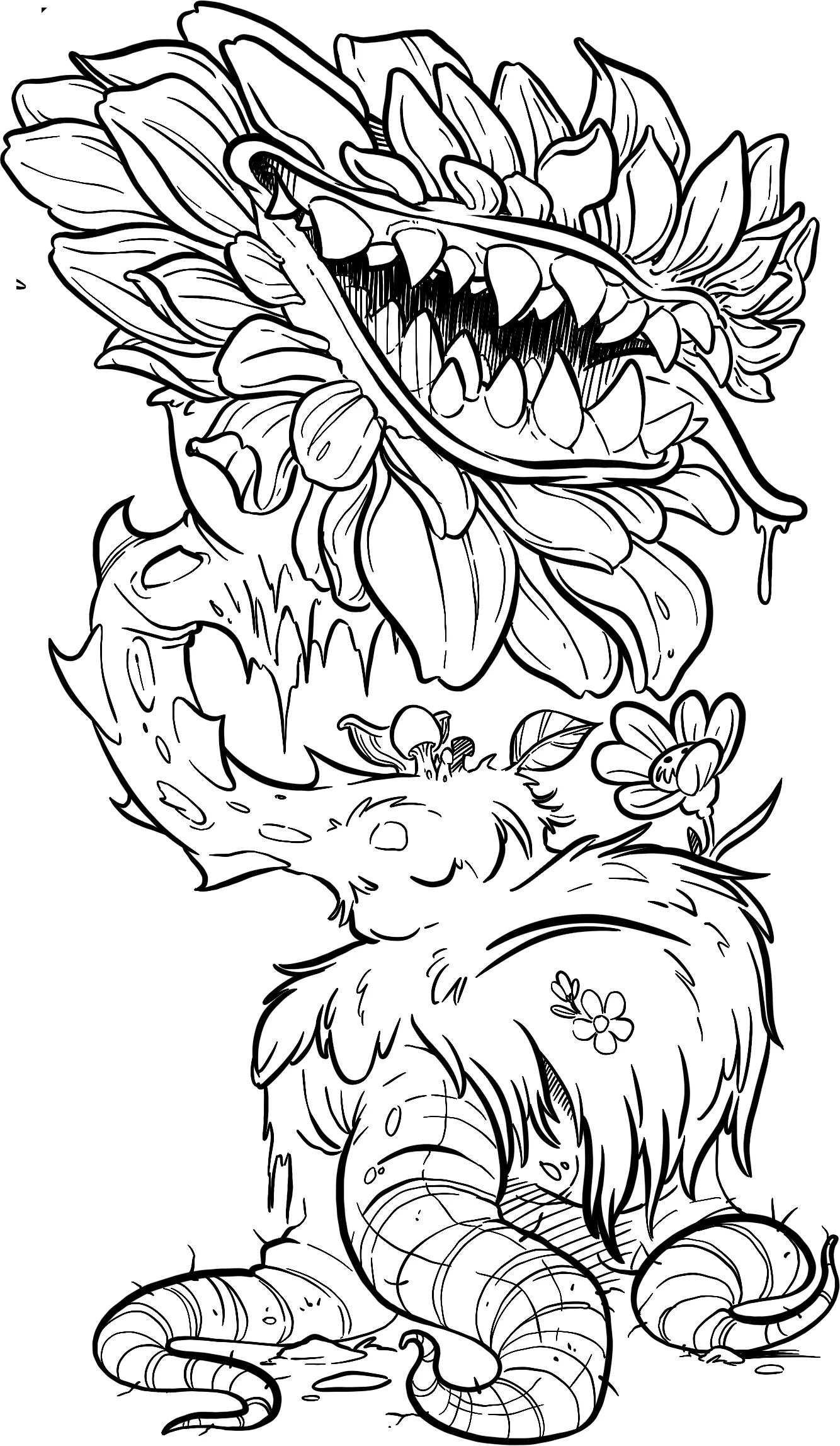 A huge carnivorous flower with a maw of jagged teeth, and a massive thick warted stalk coiling vines that writhe across the ground
