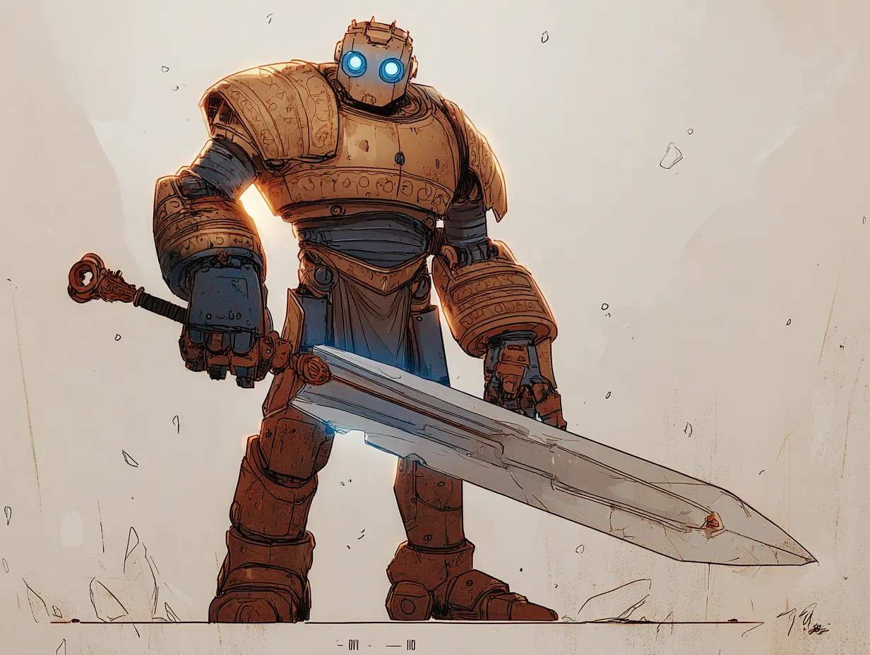 A hulking, iron-plated Clank wielding a massive greatsword with two eyes that glow with a cold, blue light.