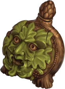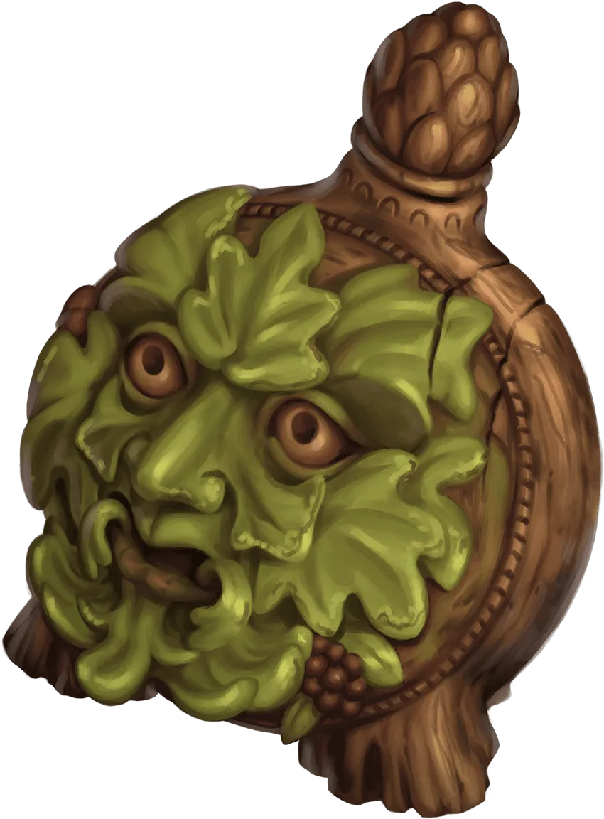 This bottle is carved from wood, with a green, leafy face adorning its surface. The liquid is a deep green streaked with shades of umber.