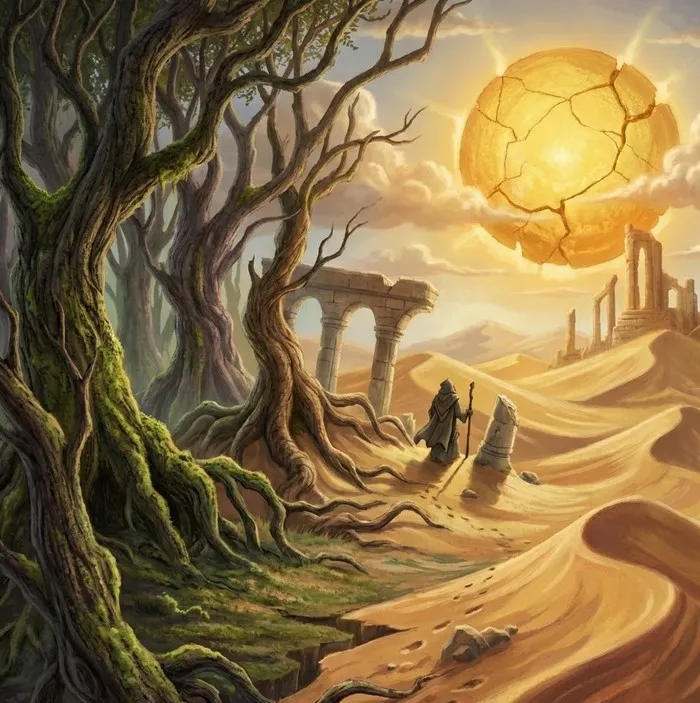 The transition zone between the Veridian Scar (dense, dark forest) and the Dune Sea (sun-baked, rolling dunes).