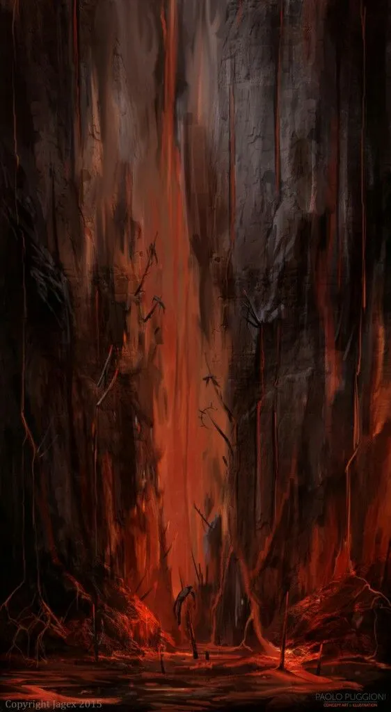 The ash you’ve trawled through begins to bcome more solid, the tunnel opening up slightly more until you enter a large cavern. Your attention is demanded by a gargantuan furnace in its center, a pillar of metal intertwined with black bone and spewing sickly flames. You realise the ash beneath your feet it compounded with skeletal remains, the heat begins to blur your vision as a prayer echoes out through the cave.
