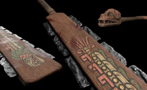 A sturdy wooden club that is fixed with thin glass carvings along its edges. The glass shatters off when striking to deal more damage.