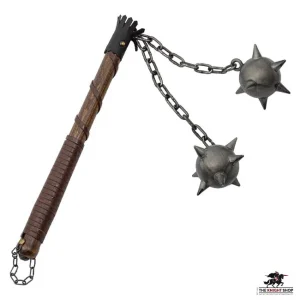 A flail with two heads attached by gnarled, grotesque, fleshy chains. The flail ends hold two baboon heads, one that is screaming and wild while the other is fierce but collected. When holding the flail there is an emotional chaotic feeling that overwhelms you, as destruction must be had, but the need to be calculative or feral in your destruction overtakes the mind when wielding this weapon.