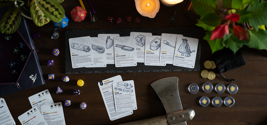 Torch, Tinderbox, Food Ration, Drinking Pouch, Gold Pouch, Bedroll, Rope, Simple Knife, plus the custom Environment Wilderness in Tarot Card size.